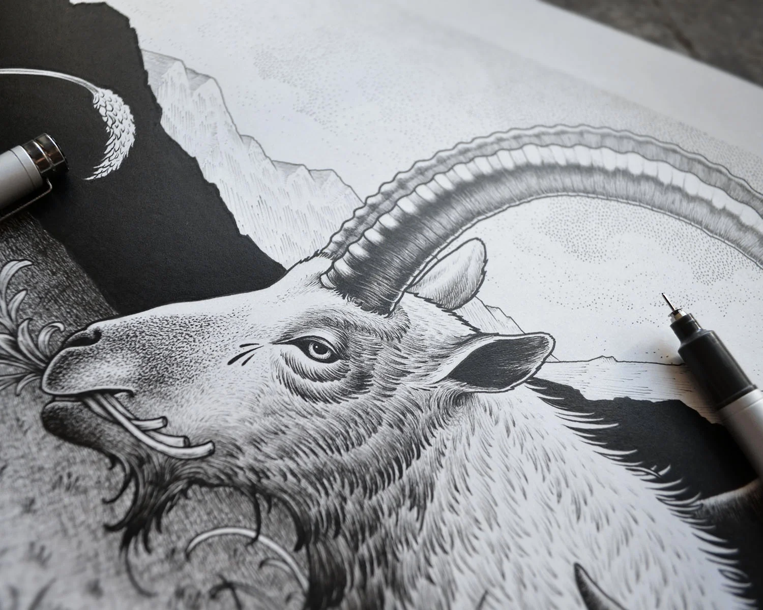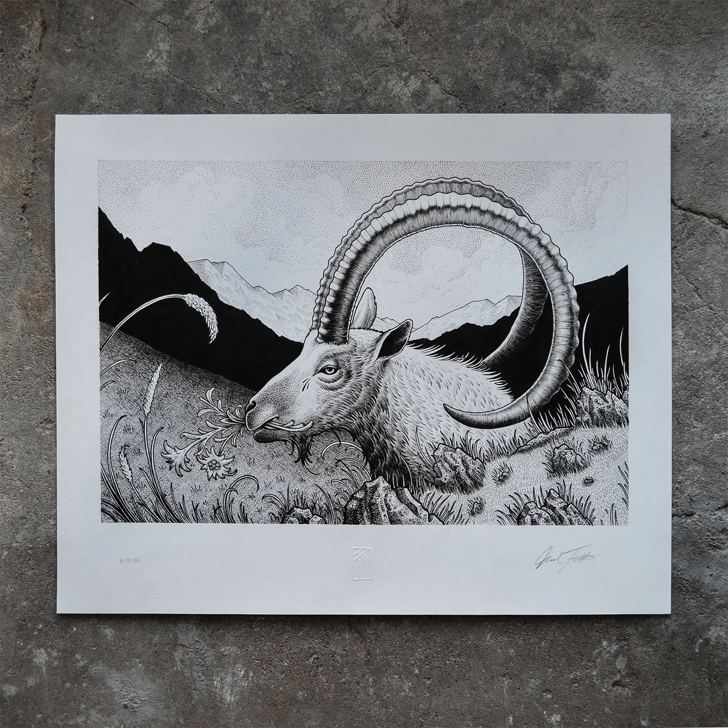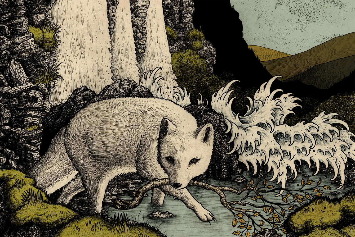 A series of highly detailed illustrated ecosystems. The three illustrations represent the natives species and environments within Switzerland, Italy, and Iceland.
